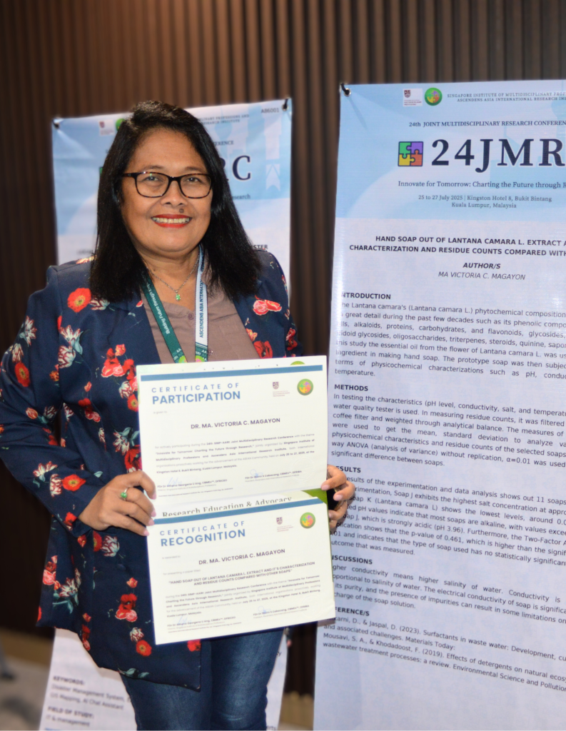 At the 24th Joint Multidisciplinary Research Conference (24JMRC) in Kuala Lumpur, Malaysia, Dr. Magayon presented her study: